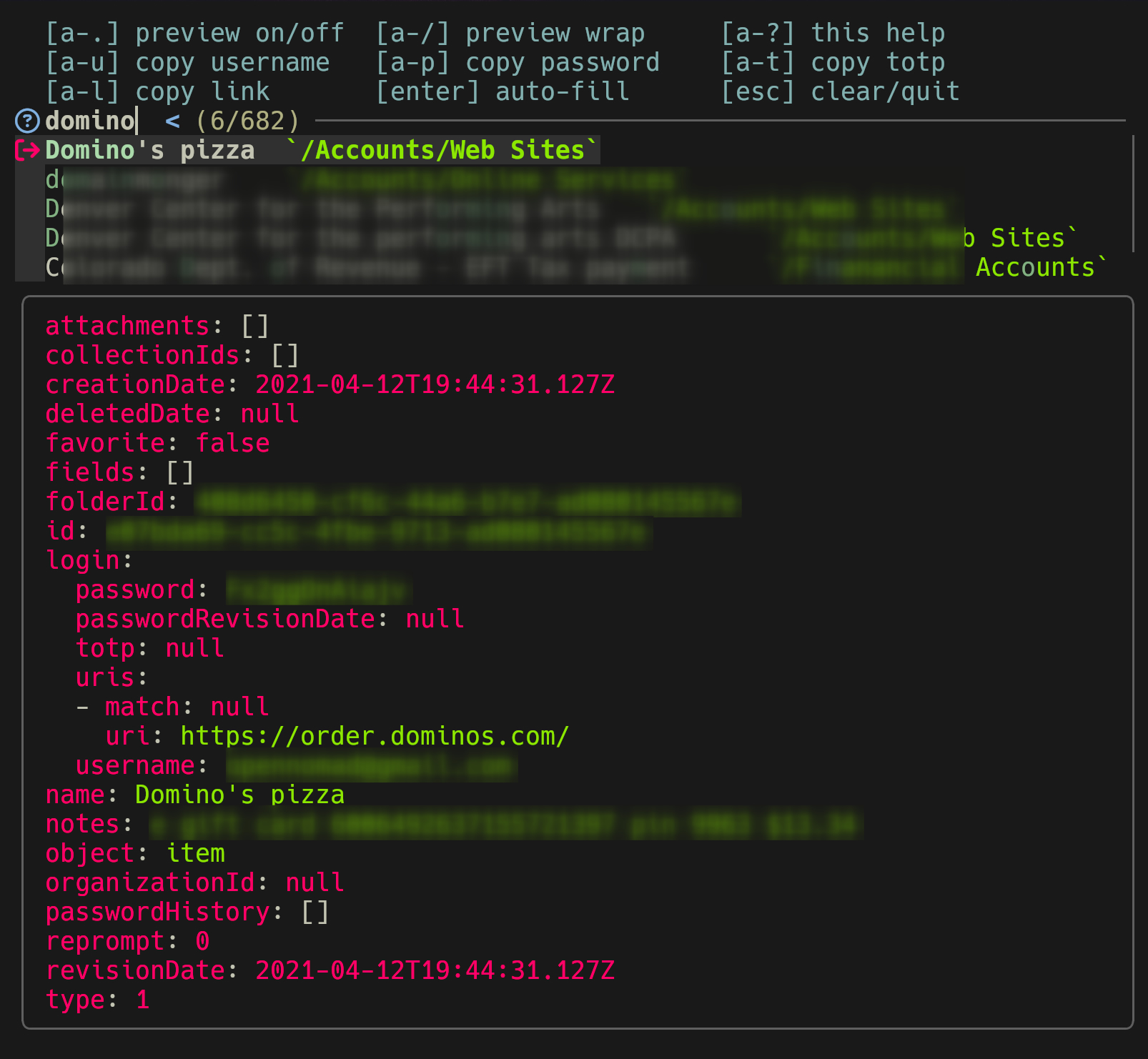 bwzy is a fuzzy finder and auto-filler for Bitwarden (read-only at present). It runs in the terminal and uses the official bitwarden CLI.