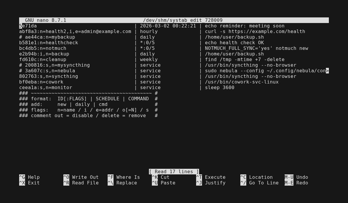 - Add -X <id|name> to stop, disable, and remove a job's unit files; mutually exclusive with all other management options; 13 new tests - Add demo/test-tapes.sh to verify all VHS tape commands run cleanly; wired into pre-commit hook alongside test.sh (combined badge count) - Rename demo job names to *_home variants to avoid clashing with real user jobs; add per-tape preflight cleanup via -X - Consolidate four demo GIFs into quickstart + all-features + editmode screenshot; remove notifications/services tapes Co-Authored-By: Claude Sonnet 4.6 <noreply@anthropic.com>